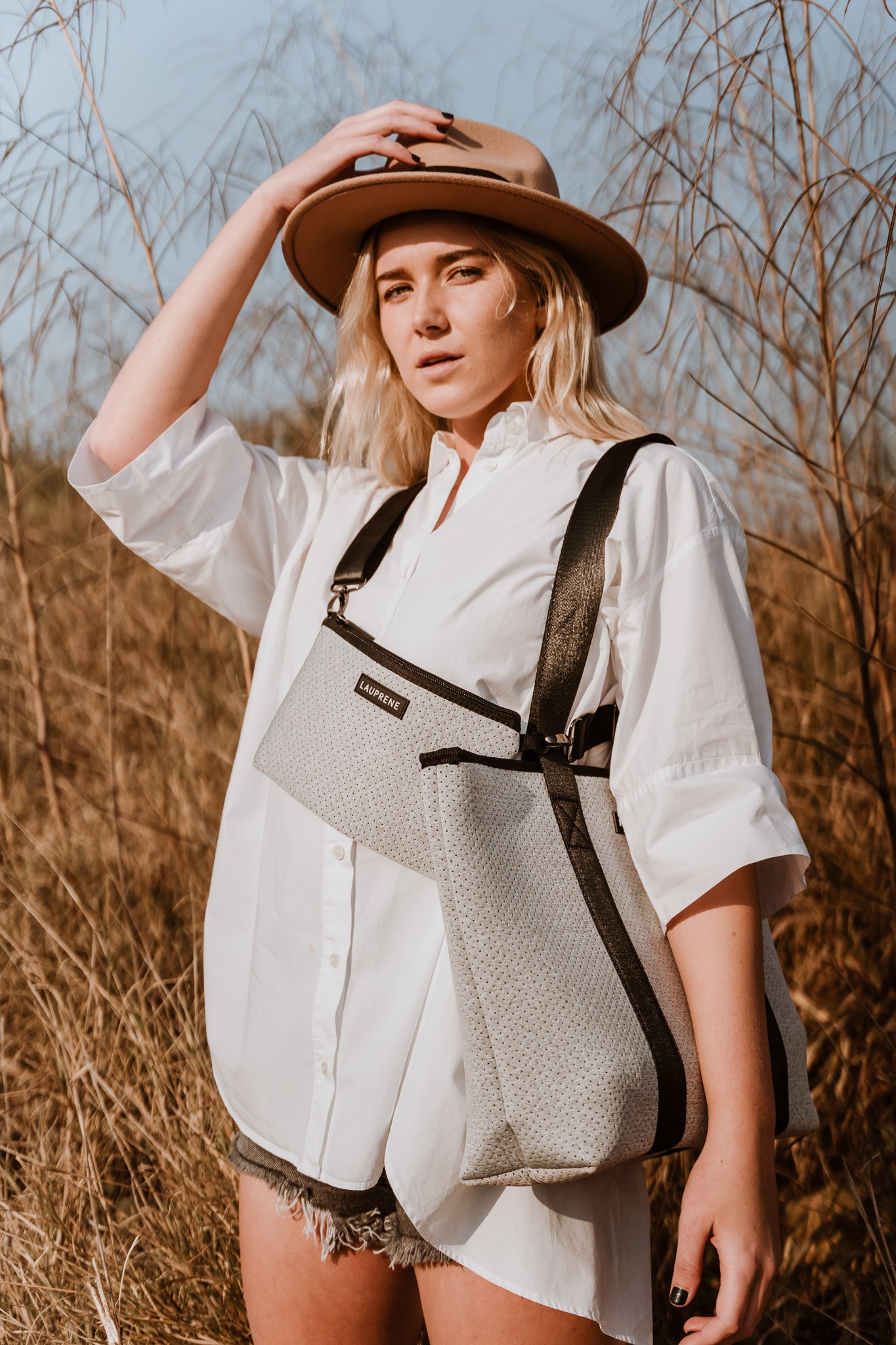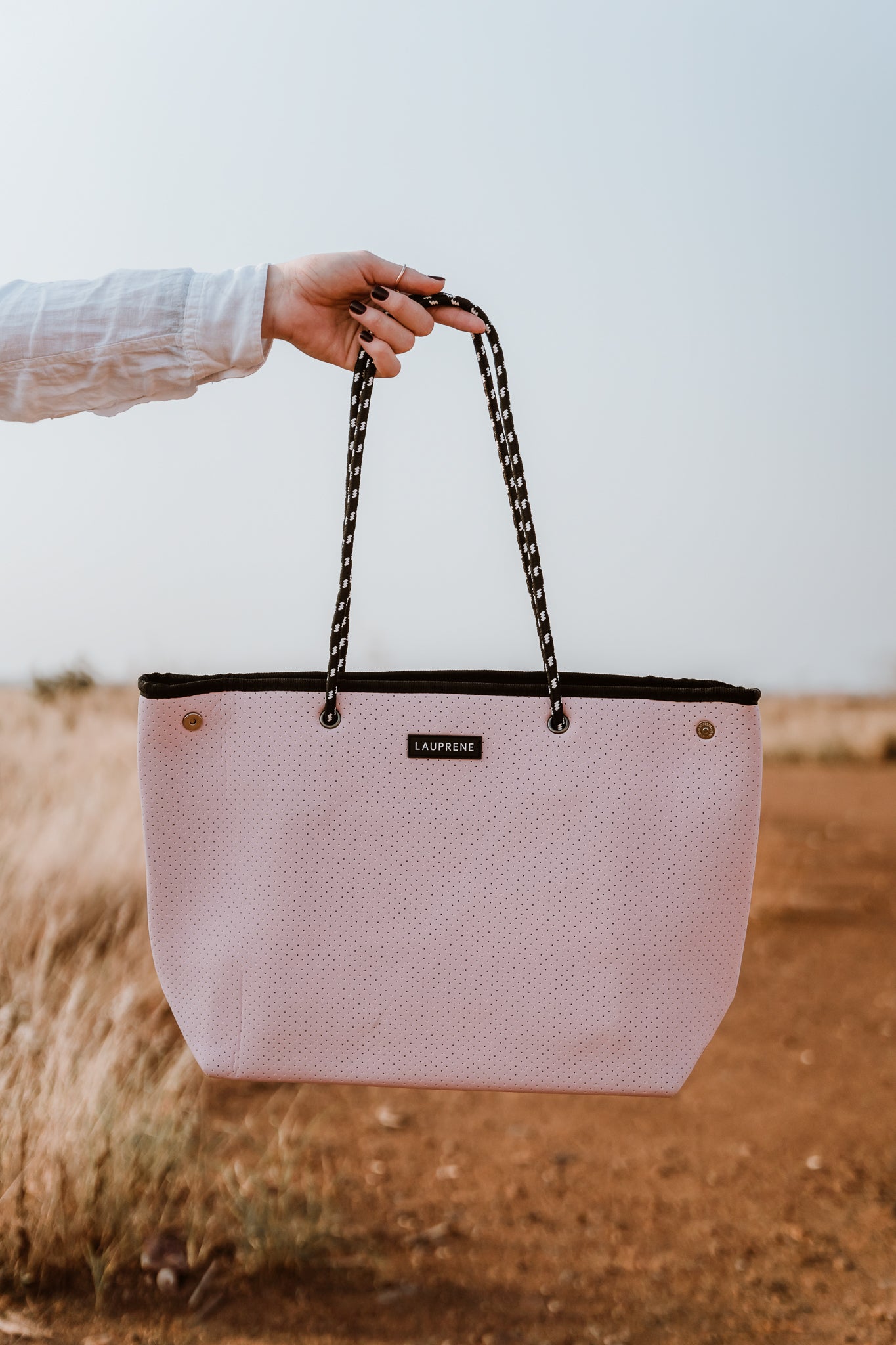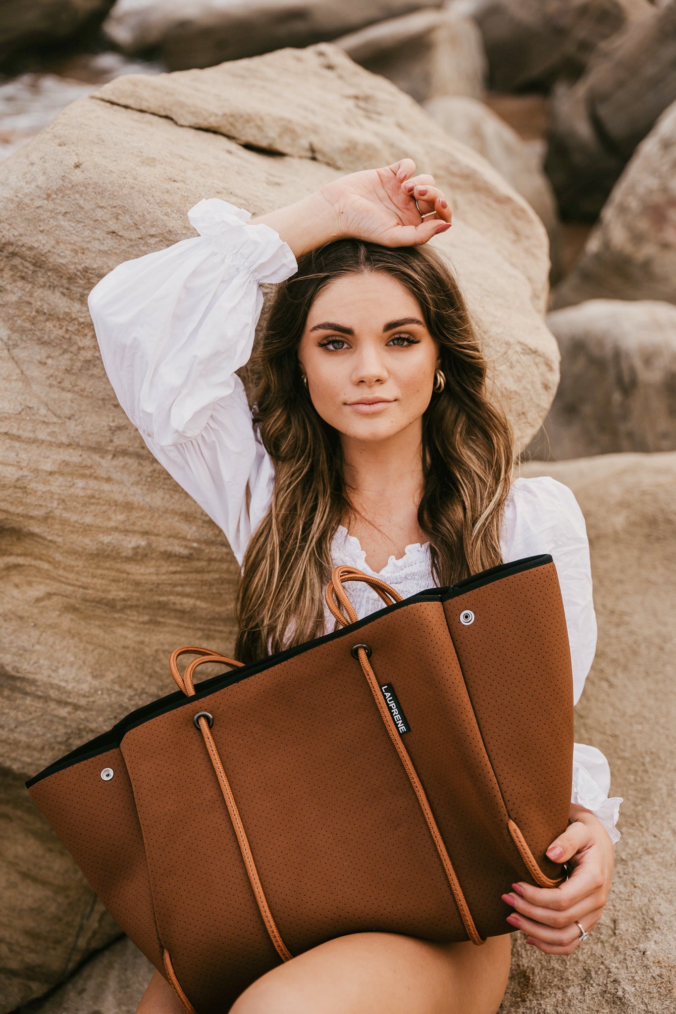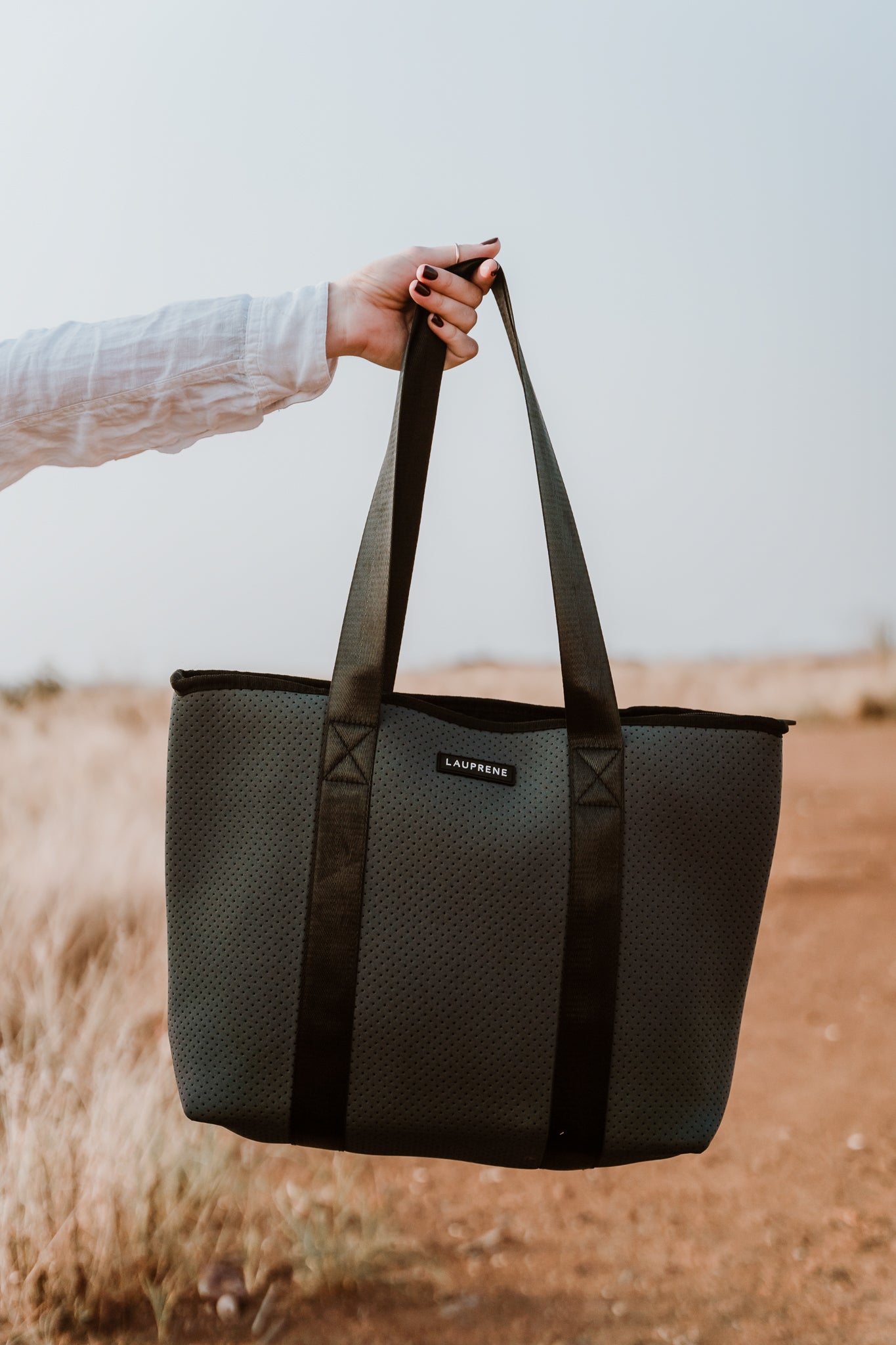 Our Neoprene tote is large enough for all your seaside essentials. No need to panic if you spill your ice-cream or the tide gets a little too close. The light weight, perforated neoprene is machine-washable and water resistant.