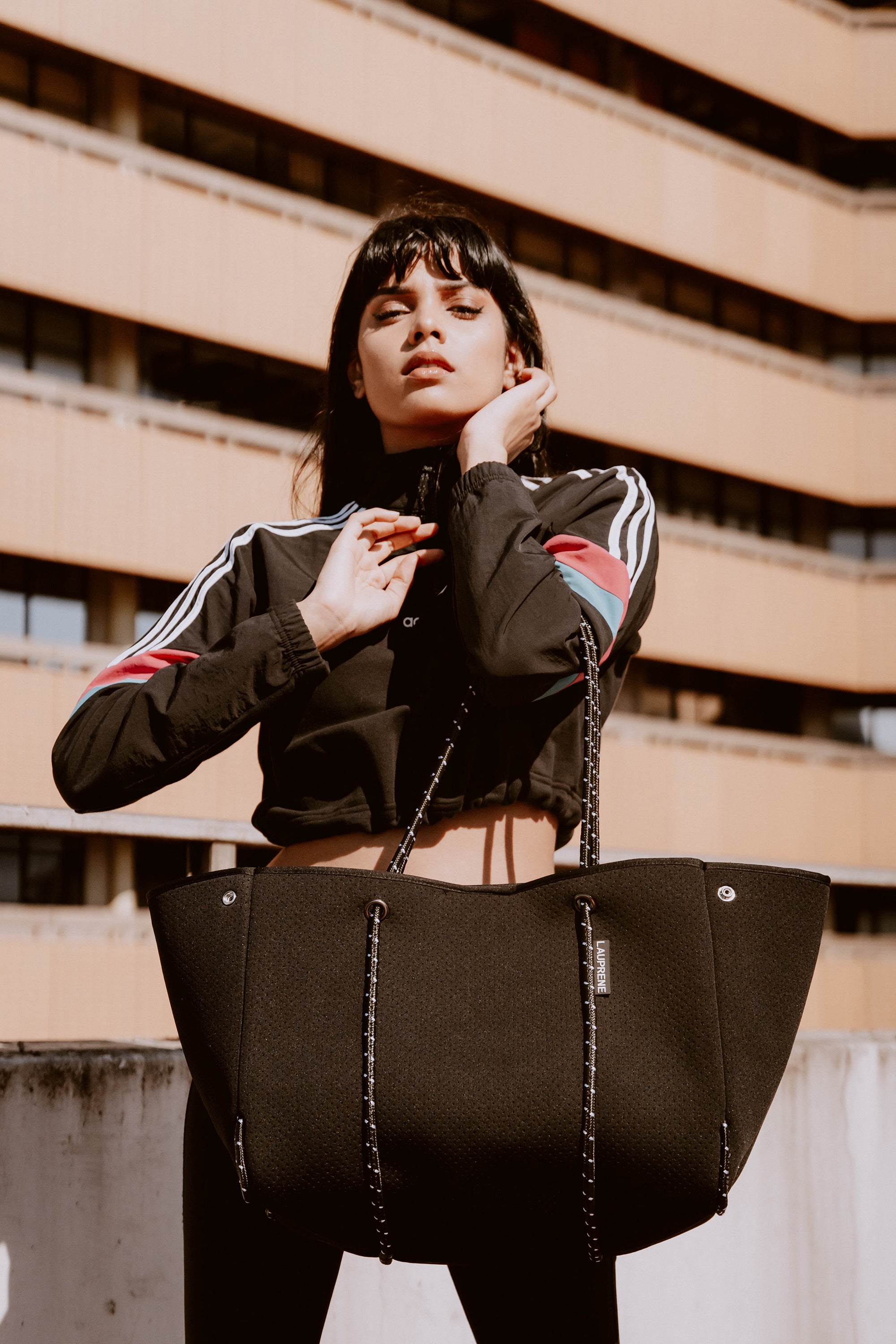 Our Neoprene tote is the ideal bag to bring fresh clothes to the gym and take sweaty clothes home. It's versatility allows you to pack all your necessaries for pre and post-workout. The light weight, perforated neoprene is machine-washable and water resistant.