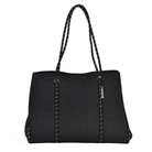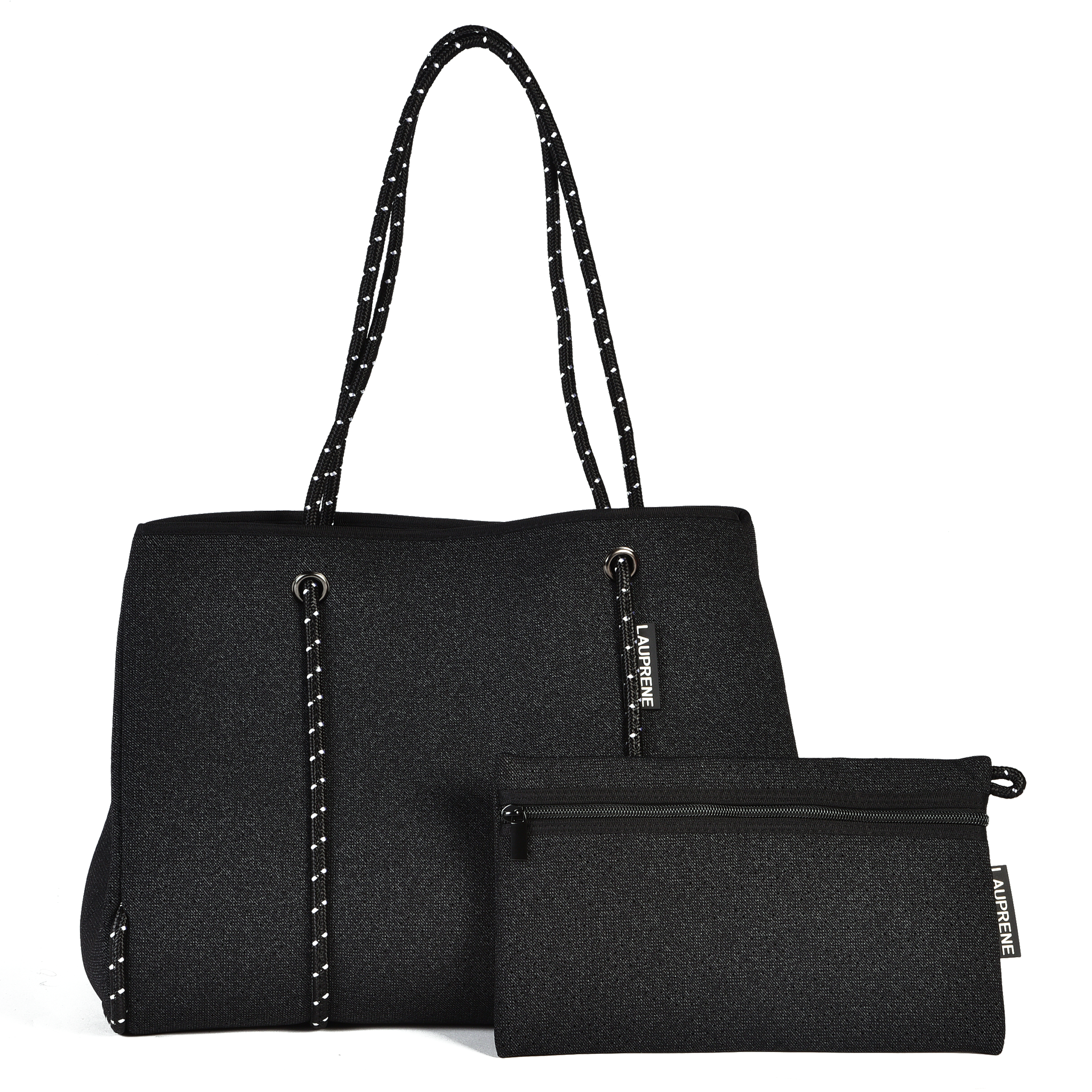 Invest in durability with this classic black neoprene tote bag. It is light, versatile, and has a detachable purse or clutch. The tote's magnetic closure ensures essentials stay locked tight. A stabilizer board is included for convenience and added protection. All our bags include a dust bag for easy storage and transportation.